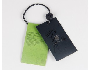 此款服裝吊牌制作,采用400g雙銅紙,商標燙銀服裝吊牌設計采用了綠色和黑色的搭配,能給人一種協調,美觀,大方的感覺。服裝吊牌制作加上尼龍圓繩的暗扣吊粒,簡單,清新。