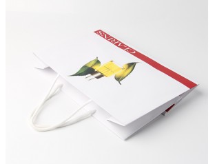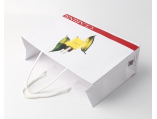此款紙袋包裝采用250g單銅紙,四色印刷,過啞膠,紙袋提手處采用尼龍圓繩。紙袋包裝設計走的是小清新風格,以白色作為主打色,印刷其他黃色和紅色作為點綴,簡約大方駿業紙袋包裝采用優良材質,流程機械化與人工相結合,免費設計,量身定制打造中高檔化妝品紙袋包裝。