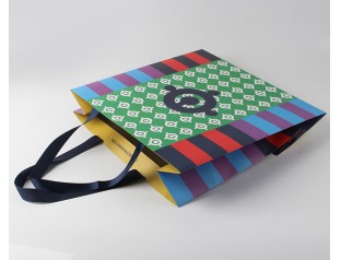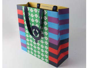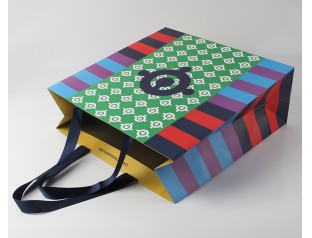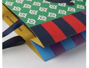 此款手挽紙袋采用250克單銅紙四色印刷過啞膠,不打孔粘扁繩。小清新條紋手提紙袋,環保美觀、精致耐用。深藍色的絲帶作為手提紙袋的手提繩,高檔大方。想了解更多的手提紙袋,歡迎致電廣州駿業包裝廠